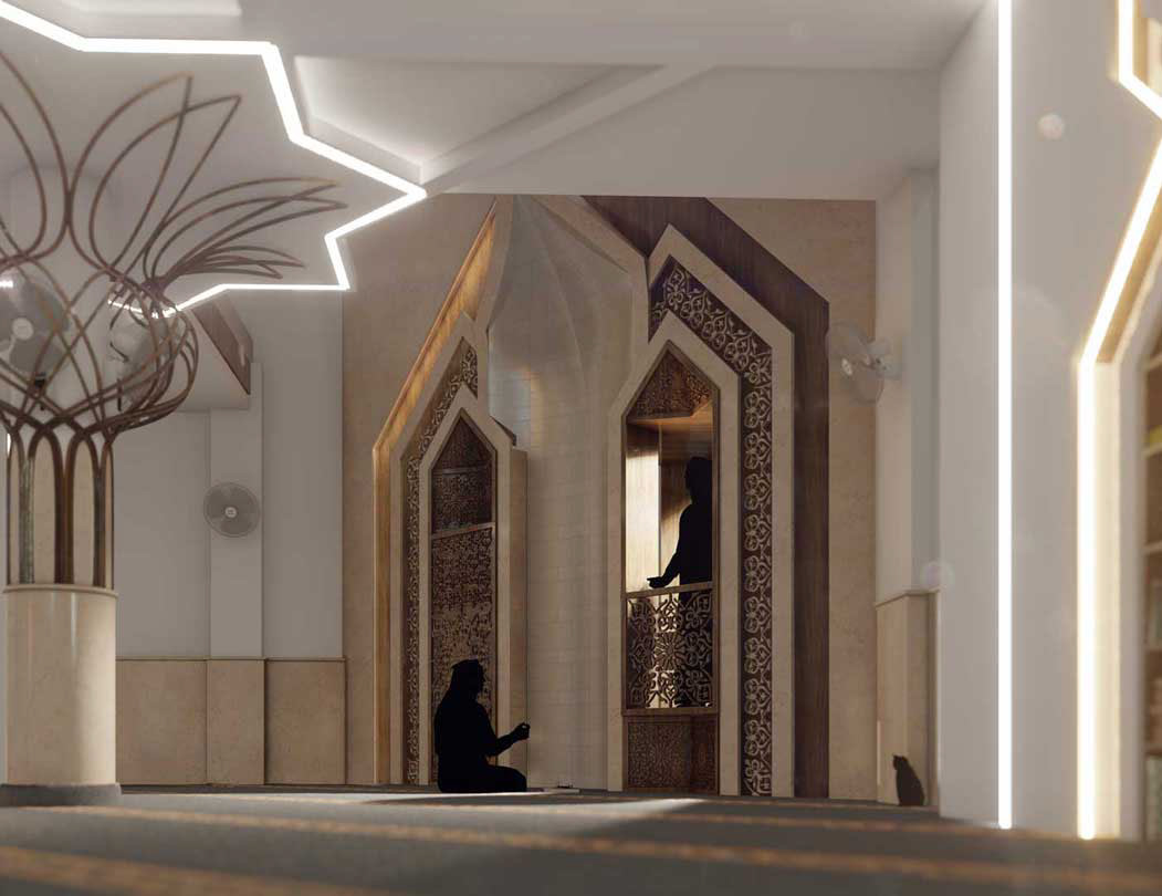 تبلغ مساحة قاعة الصلاة حوالي 500 متر مربع وتوجيه المبنى الغير متعامد مع اتجاه القبلة اثار تحديات تصميمية, لكن فريقنا قام بالتعامل مع هذه التحديات بتميز